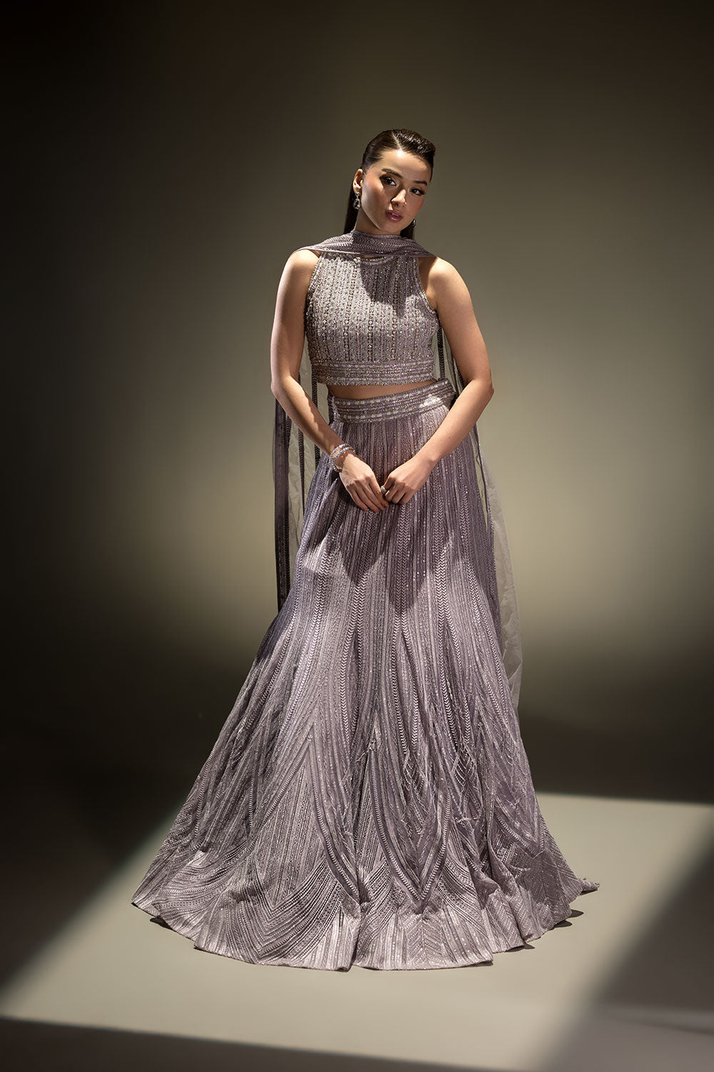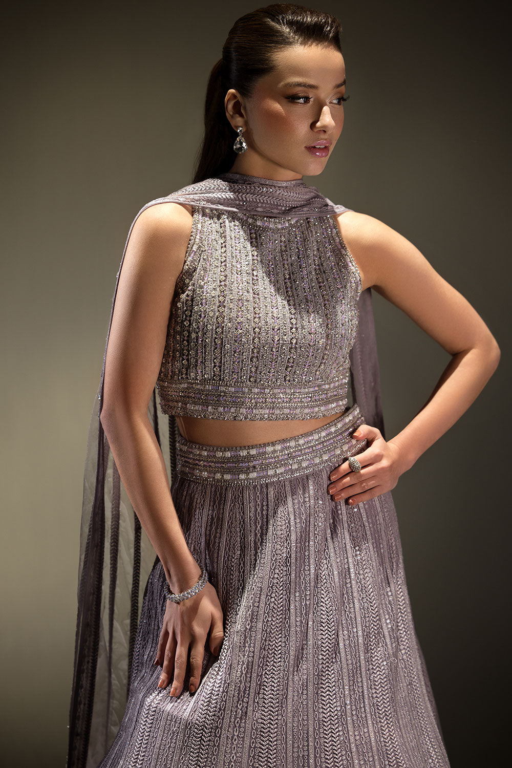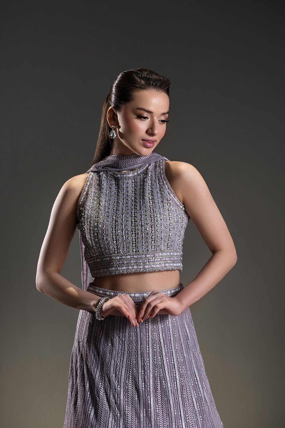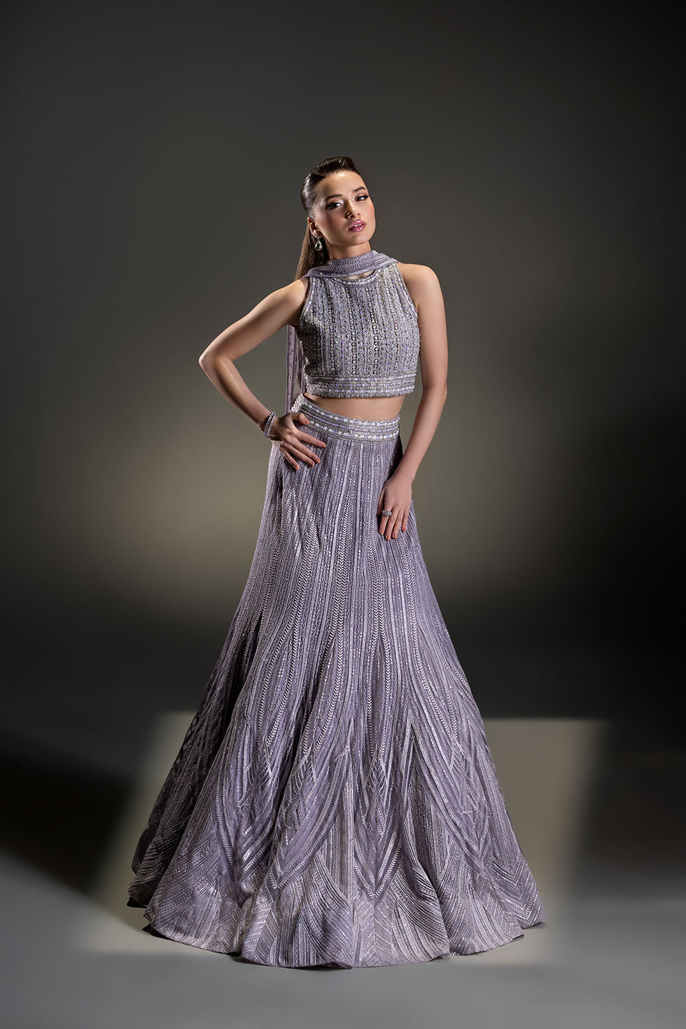 A charming lehenga choli in a serene purple hue, exquisitely embroidered with resham and sprinkled with sparkling accents for a captivating finish that add a magical shimmer to its beauty