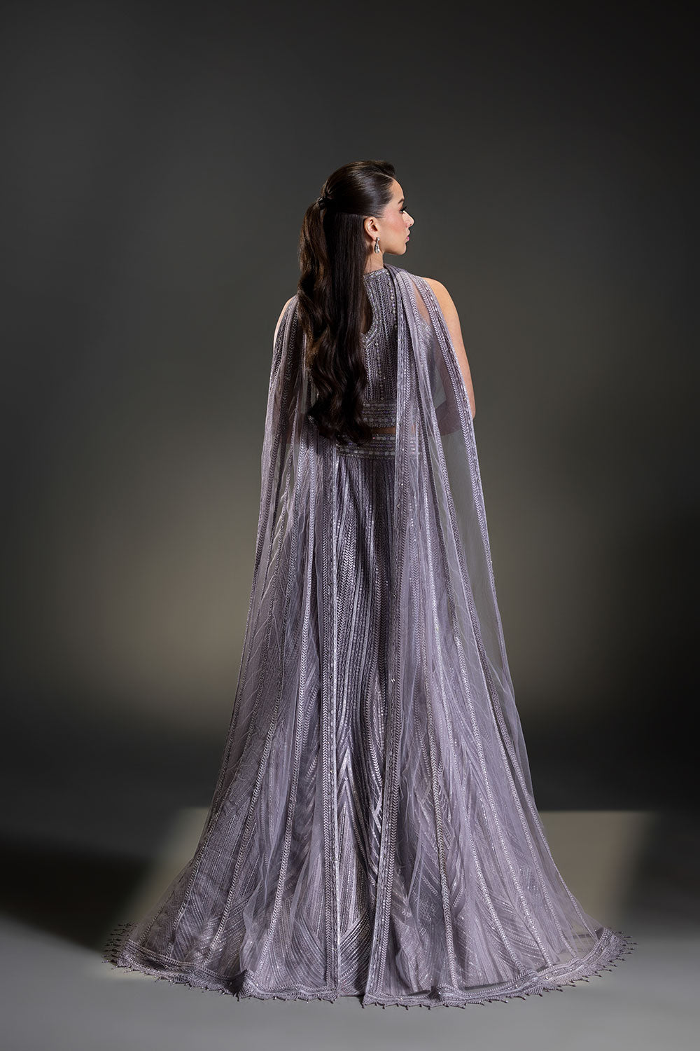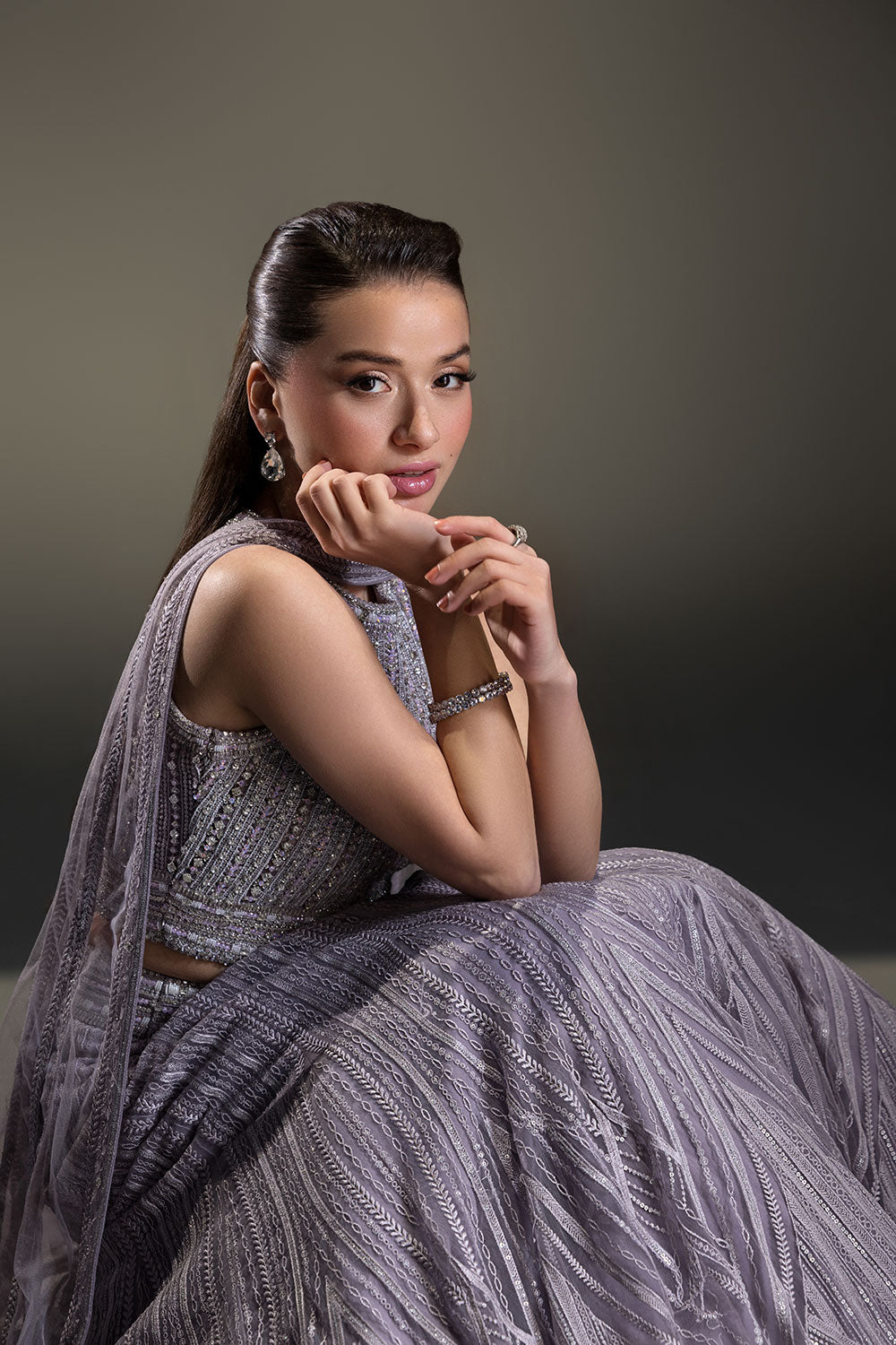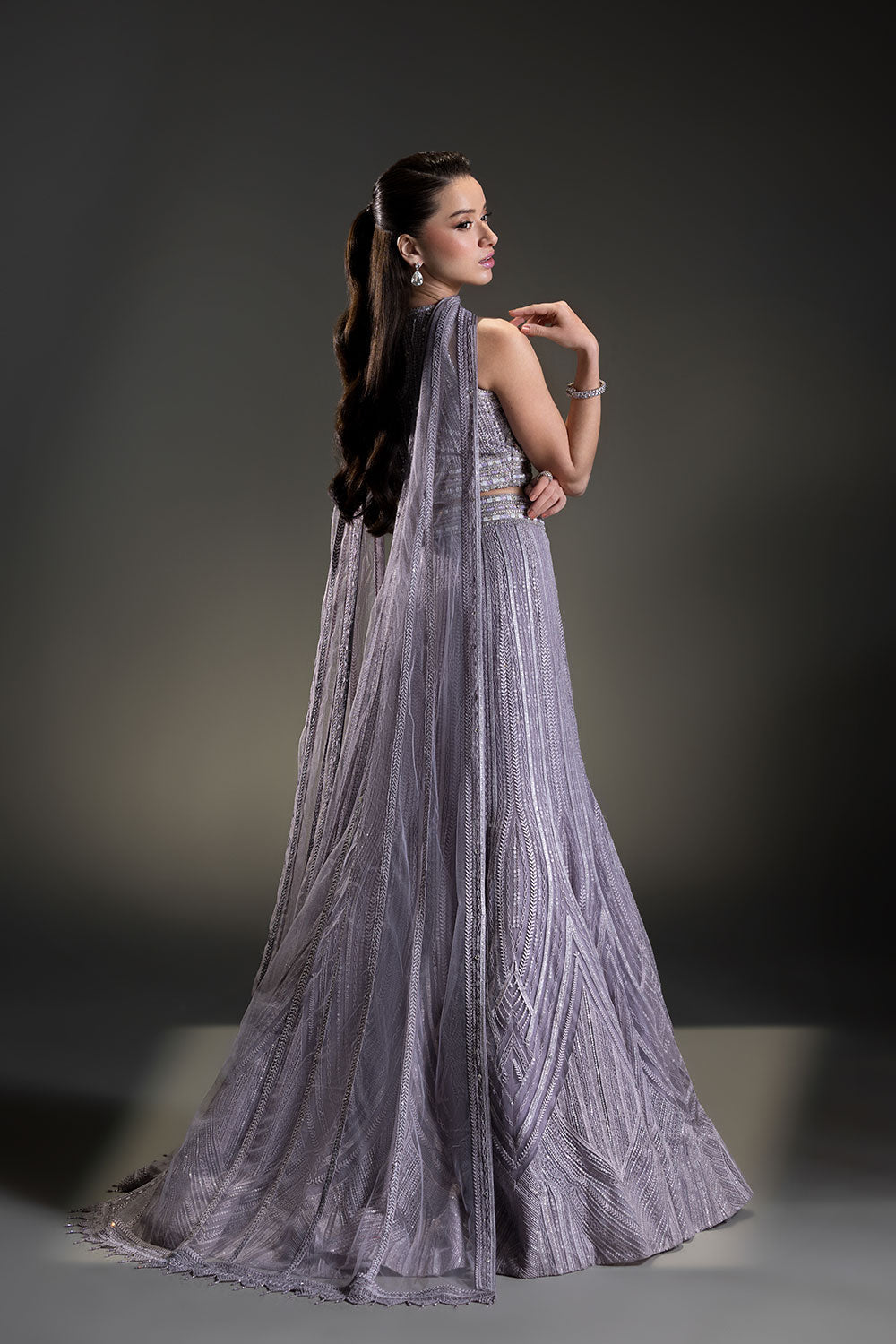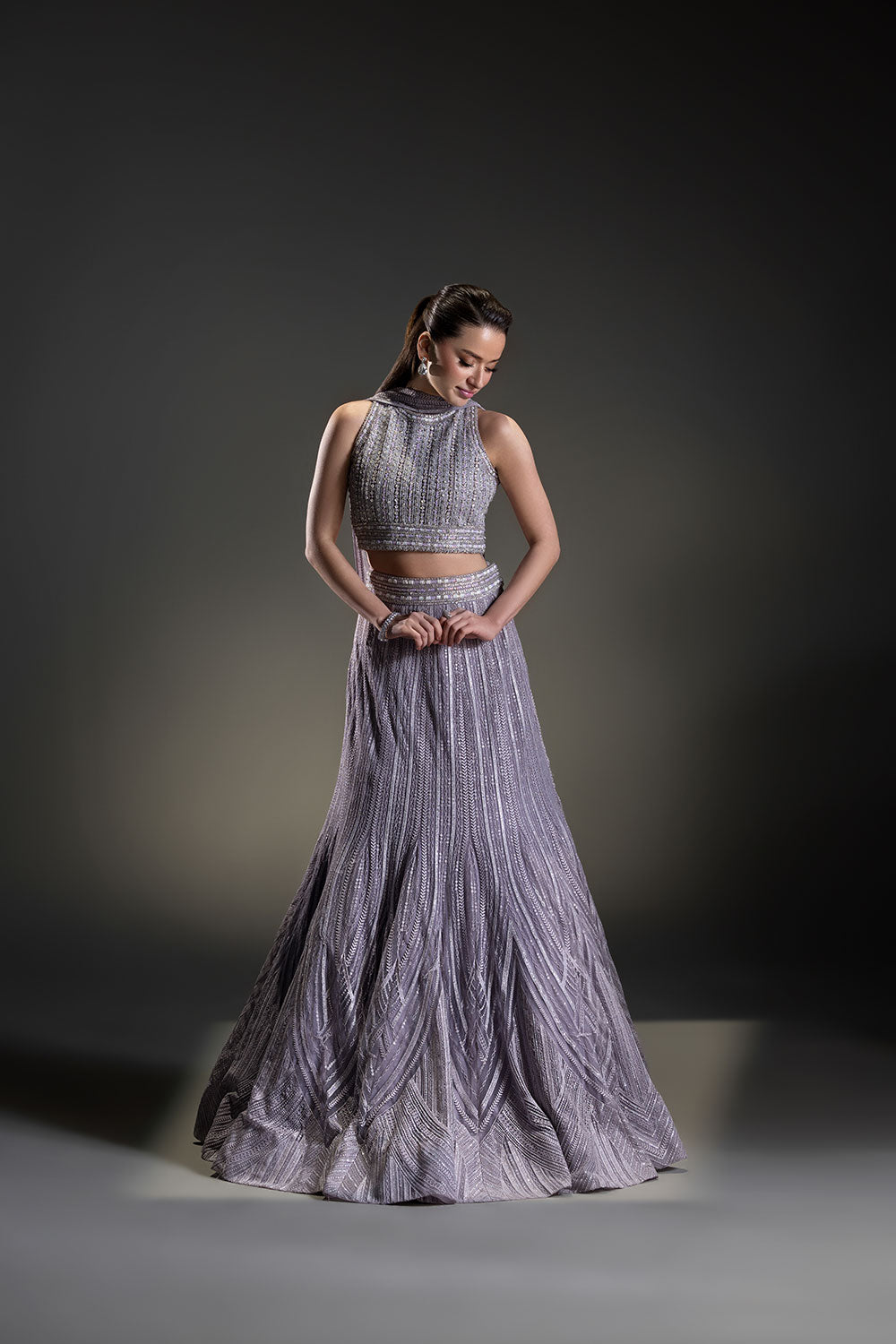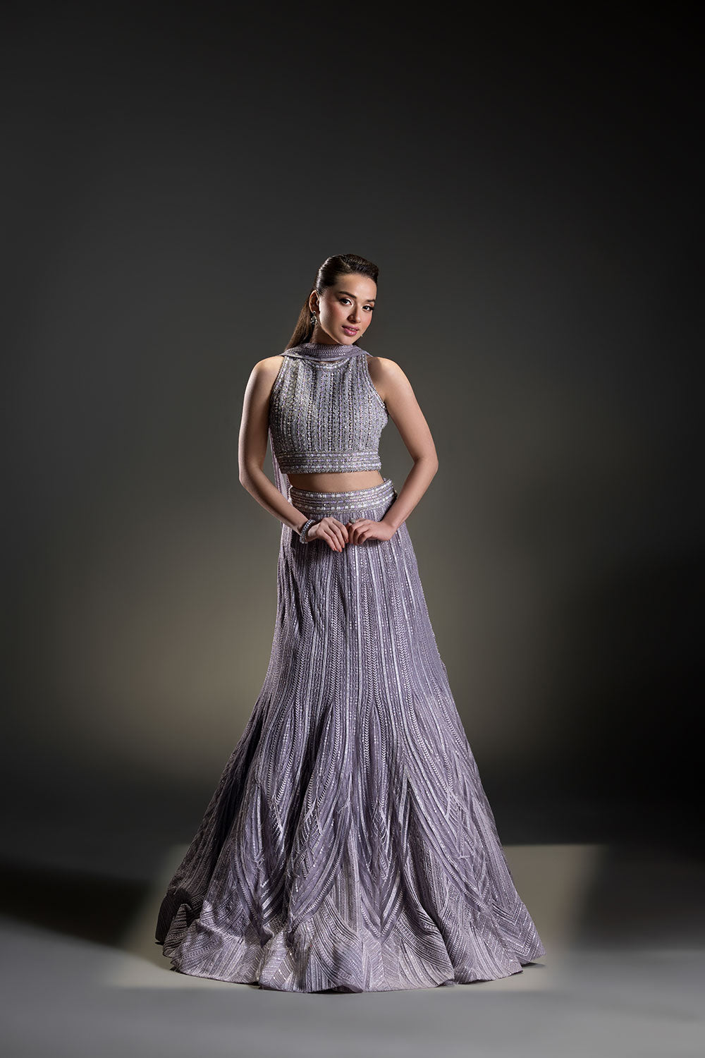 A charming lehenga choli in a serene purple hue, exquisitely embroidered with resham and sprinkled with sparkling accents for a captivating finish that add a magical shimmer to its beauty