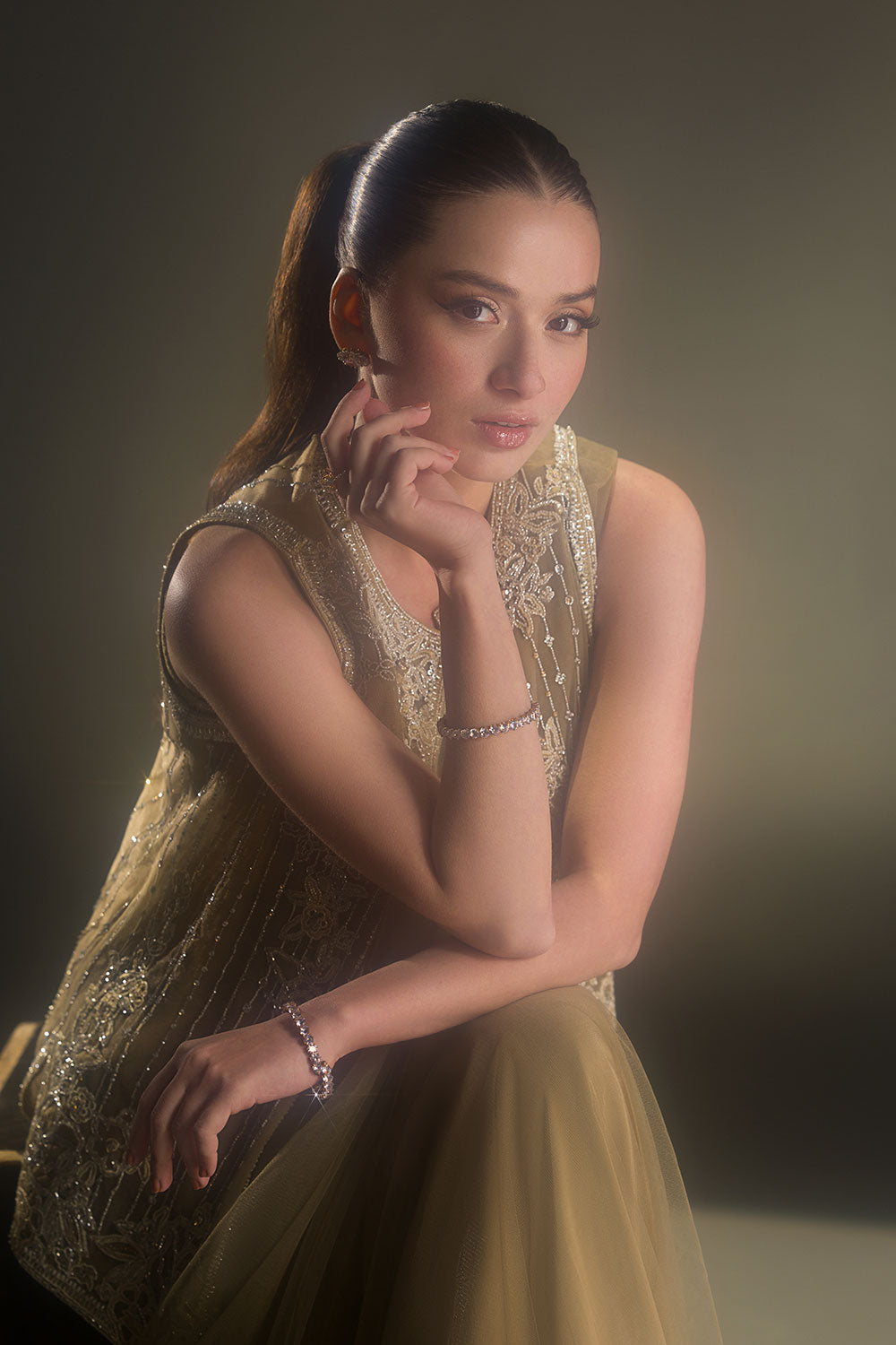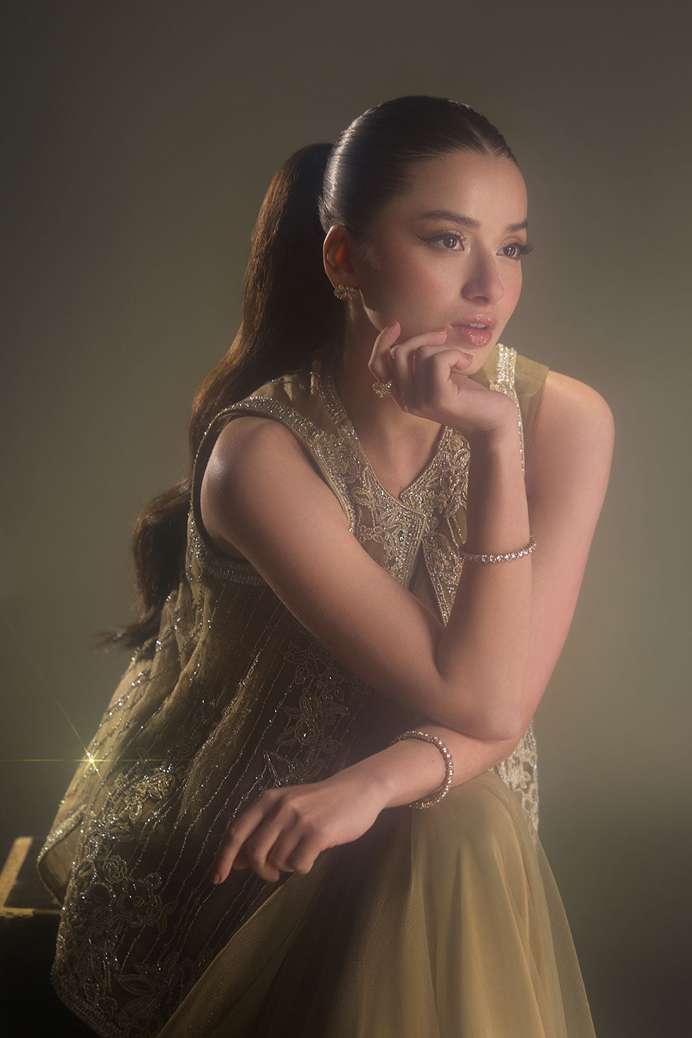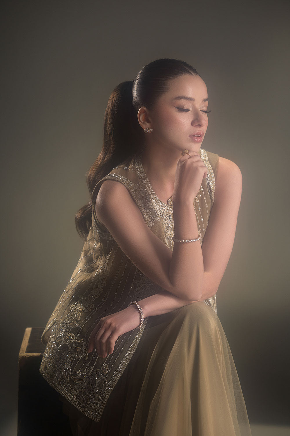 An exquisite front-open jacket, shimmering with crystal  delicate beads, and lustrous pearls, crafted in a rich antique gold hue. Paired with a modern draped saree, this ensemble effortlessly blends timeless elegance with contemporary charm.”